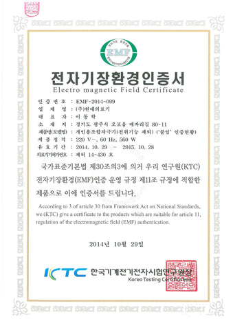 Safety and absence of harmful electromagnetic fields is confirmed by EMF tests in Korean registered Laboratory.